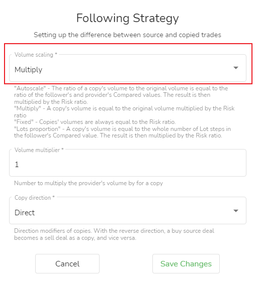 يعتمد حجم تداول النسخ على الرصيد الحالي أو حقوق الملكية لحساب التابع. يمكن للمتابعين تعديل حجم تداول النسخ وفقًا لرصيد الحساب الجاري أو صافي القيمة للتحكم في مخاطر النسخ