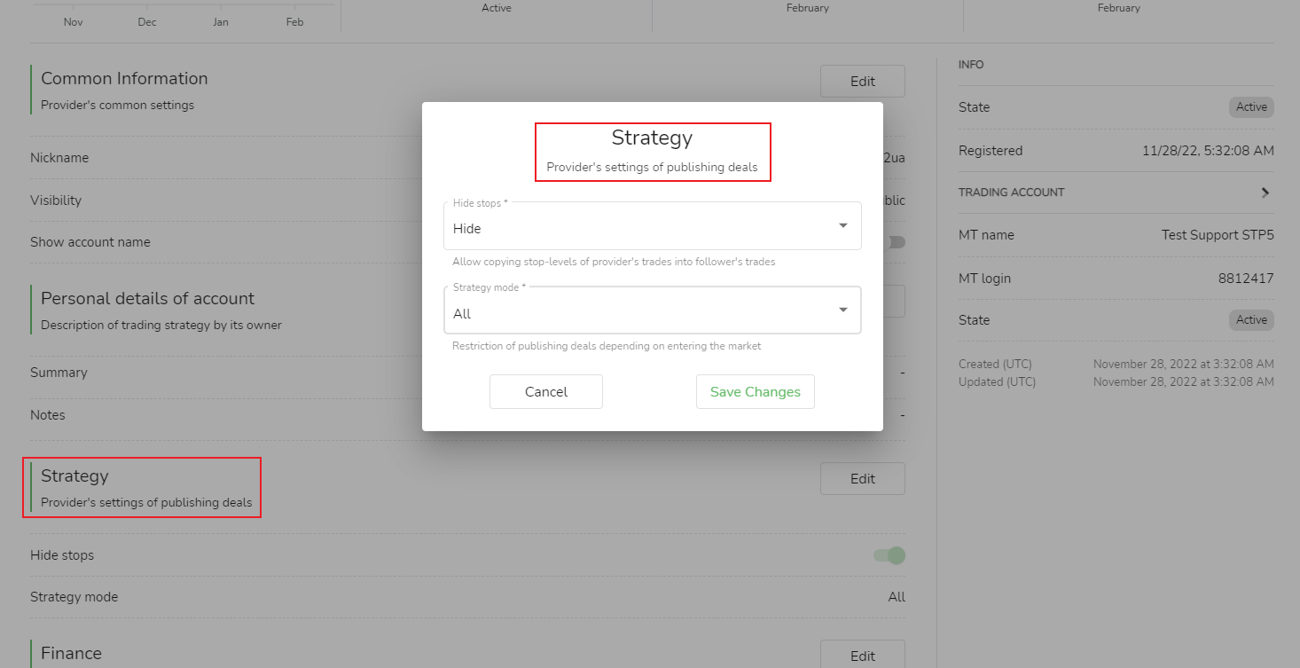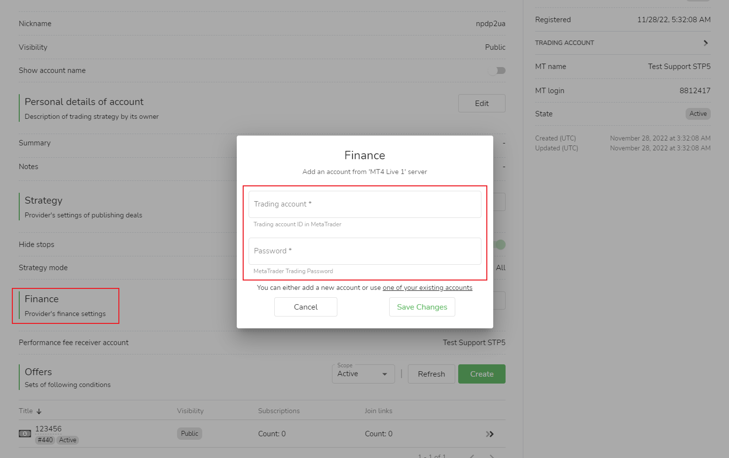 حساب قبول رسوم الأداء:حساب التداول الذي يجمعه مصدر الإشارة المتابعين لدفع رسوم الأداء لمصدر الإشارة يمكنه اختيار حساب موجود أو إضافة حساب جديد.في عملية إضافة حساب جديد ، تحتاج إلى ملء حساب التداول (أي ، حساب التداول في MetaTrader) وكلمة المرور (أي كلمة مرور معاملة MetaTrader) ثم انقر فوق [حفظ التغييرات] لإكمال الإعدادات بنجاح.