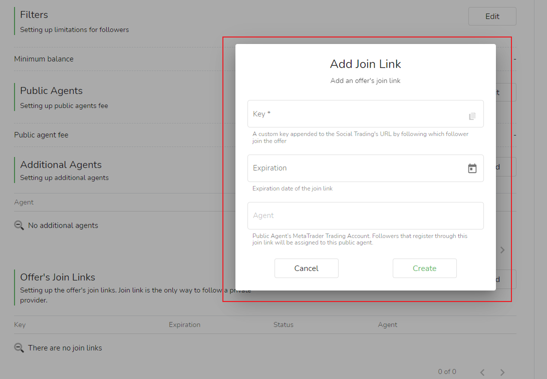 بعد إنشاء رابط الانضمام بنجاح ، سيتم عرضه في الموضع أعلاه.سيحتوي ارتباط الانضمام هذا على معلمات حساب تداول MetaTrader الخاص بالمُعرّف ، لذلك سيتم تعيين المتابعين المسجلين من خلال رابط الانضمام مباشرةً إلى المُقدم المقابل.