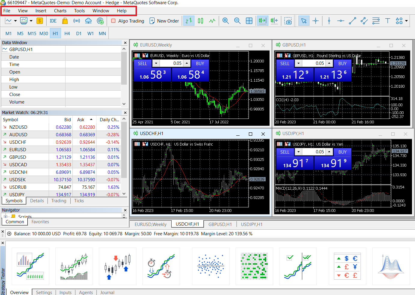 تتضمن القائمة الرئيسية جميع الوظائف تقريبًا في MT5 ، والتي تساعد المستخدمين على إجراء عمليات الرسم البياني وتحليل الأدوات وإعدادات النظام الأساسي ، إلخ. تتكون القائمة الرئيسية من الوظائف الرئيسية لكل من [ملف] و [عرض] و [إدراج] و [أدوات المخطط] و [نافذة] و [مساعدة].