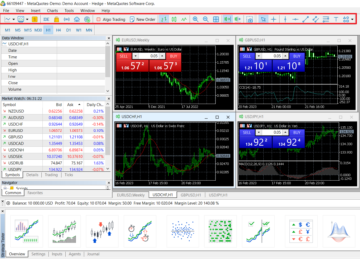 توجد الوظائف شائعة الاستخدام أو الوظائف الرئيسية في القائمة الرئيسية في شريط الأدوات ، وهو مناسب للمستخدمين للعمل بسرعة ، مثل البحث عن رموز التداول ، ووضع الأوامر ، وتعديل أنواع المخططات وإضافة مؤشرات رسومية ، وما إلى ذلك.