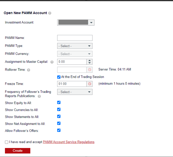 D. Complete los siguientes detalles para su nueva cuenta PAMM y haga clic en Crear. Asegúrate de leer y marcar la casilla de aceptación de los términos y condiciones.