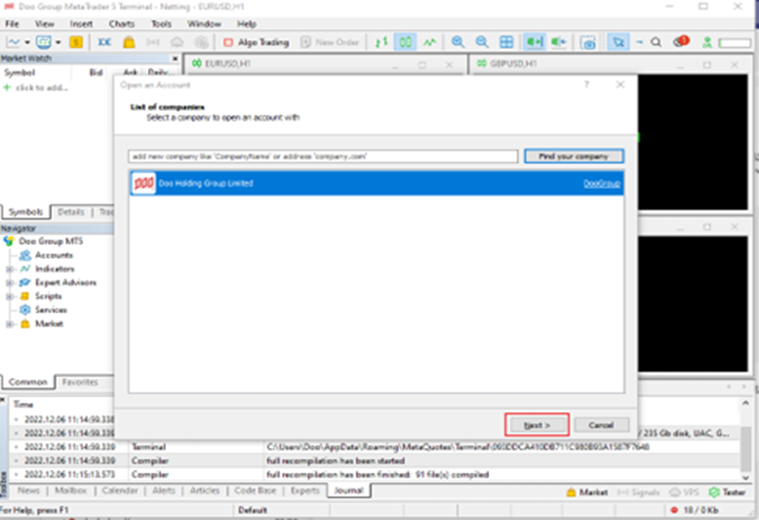 Haga doble clic para abrir MT5, seleccione [Iniciar sesión en la cuenta comercial] en la barra de menú superior [Archivo], luego busque el servidor comercial especificado y haga clic en [Continuar].