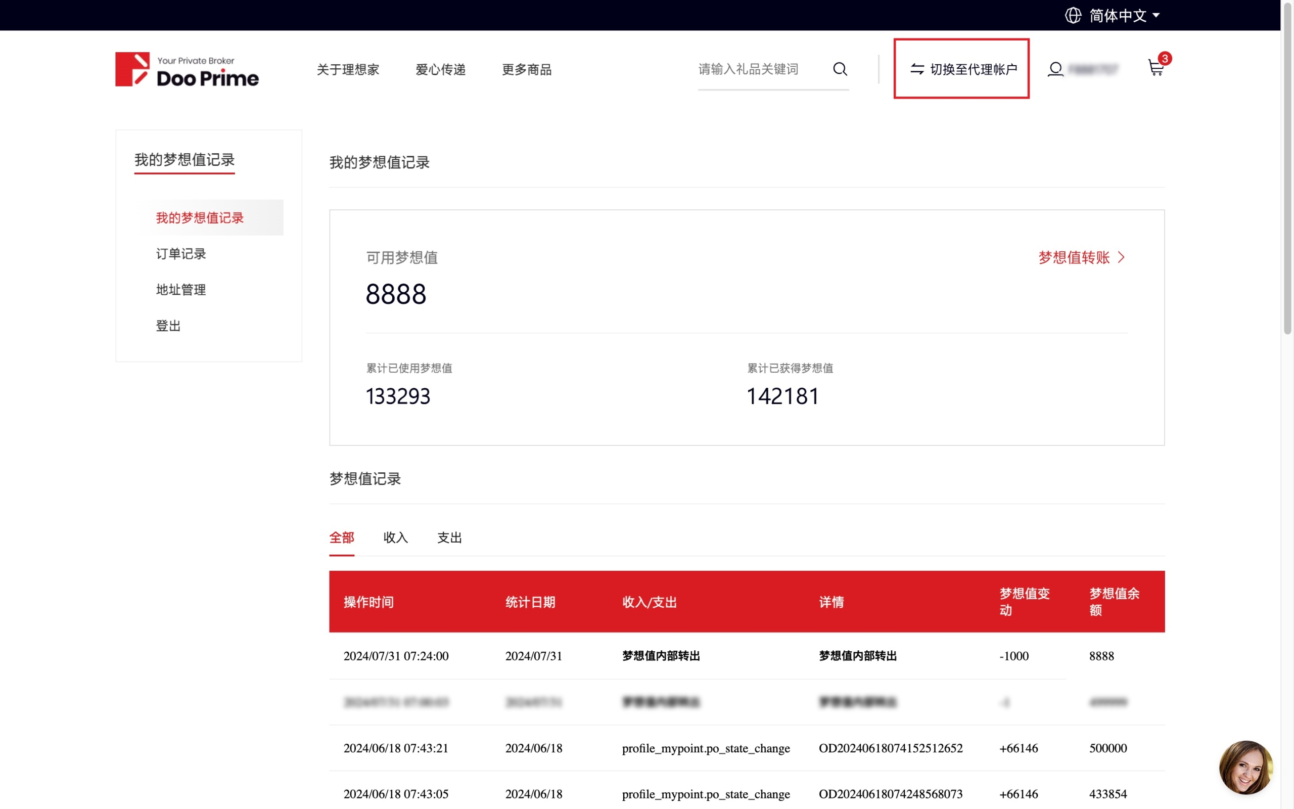 탐색바 오른쪽 상단에서 계정 역할을 전환하면 동일한 이름을 가진 계정의 포인트 상태를 확인할 수 있습니다.