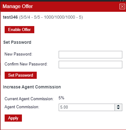 d. "에이전시 커미션" 및/또는 "비밀번호"를 변경하려면 "인용 및 팔로워" 테이블에서 "관리"를 클릭하세요. 견적 상태를 변경하려면 "비활성화" 또는 "견적 활성화"를 선택하십시오.
