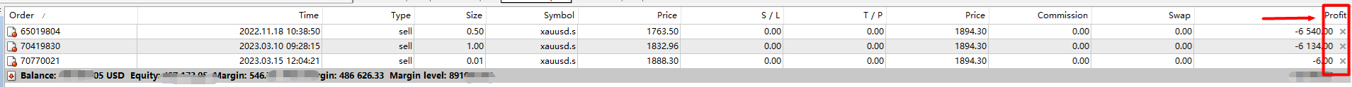 조회방법 : MT4 하단 메뉴바에서 "거래"를 선택하여 포지션 오더 확인 주문 마지막에 x가 표시되면 현재 투자비밀번호(관찰비밀번호)로 로그인중임을 의미합니다. 계정