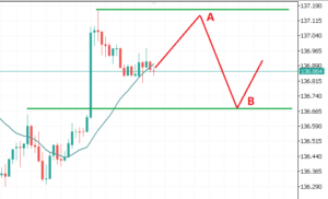 c) USDJPY의 가격이 라인 A를 하향 터치하면 라인 B에서 매도 지정가 주문을 활성화하고 가격이 라인 A에서 라인 B로 반등하면 라인 B의 가격으로 매도 주문이 실행됩니다.