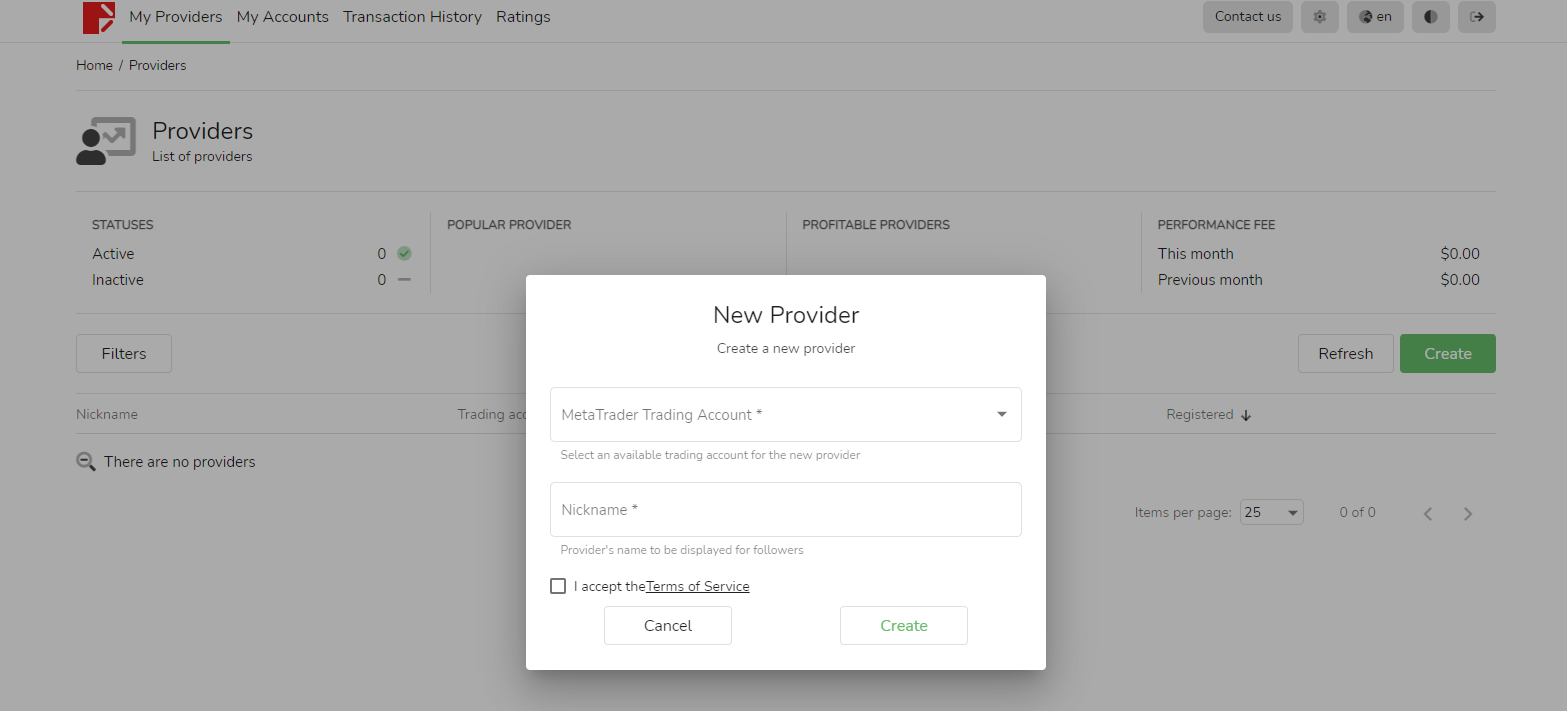 Na página [Minha conta] da fonte do sinal, você pode adicionar uma nova conta de negociação clicando no botão verde [Criar]. No entanto, esta conta não pode ser usada para fazer login e só pode ser selecionada como fonte de sinal, seguidora ou configurada para receber taxas de desempenho.
