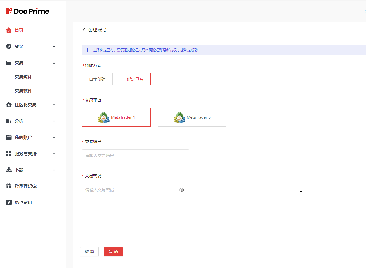 或者直接选择创建方式为「绑定已有」,然后输入「交易账户」与「交易密码」。