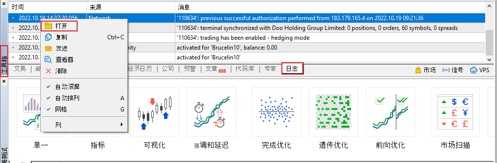 请您登录MT4 后在底部菜单栏右键点击「日志」后选择「打开」,您便可以自行保存选中的交易日志。