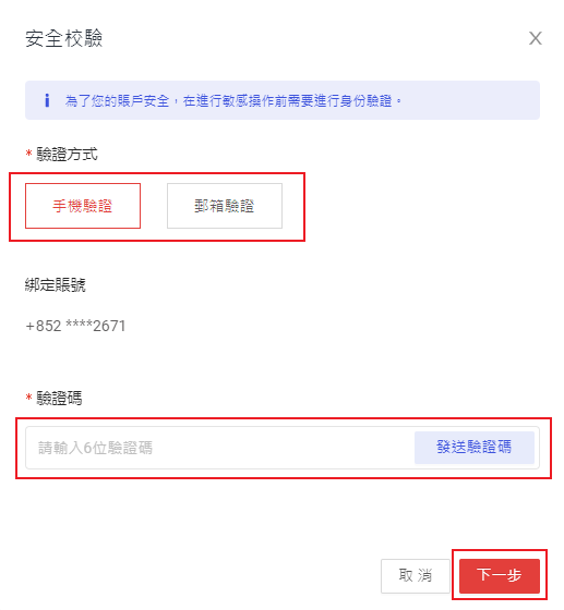 2. 可选择手机或邮件进行验证,点选「请点击进行验证」,通过验证后系统会通过手机信息或电邮发送验证码,请输入验证码,点击「下一步」。