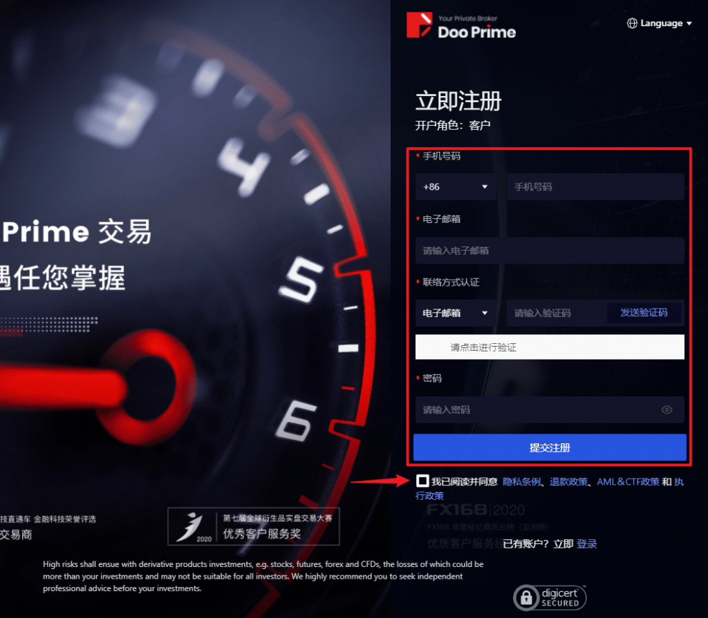 2.1 進入註冊界面後,請在右側欄目中輸入手機號碼、電子郵箱。選擇認證渠道(可選電子郵箱或手機號碼),按「發送驗證碼」進行驗證。驗證成功後,輸入密碼進行設置。最後,勾選同意條款,點擊「提交註冊」。