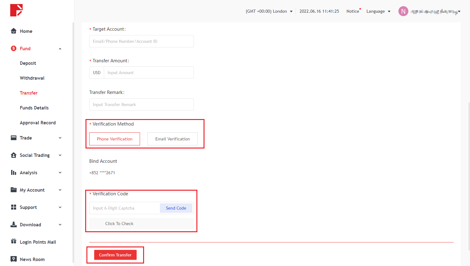 Chọn tài khoản chuyển, nhập tài khoản chuyển và số tiền chuyển. Để xác minh bảo mật qua điện thoại di động hoặc email, hãy nhấp vào "Gửi mã xác minh" và nhập mã xác minh. Cuối cùng, nhấp vào Xác nhận chuyển khoản.